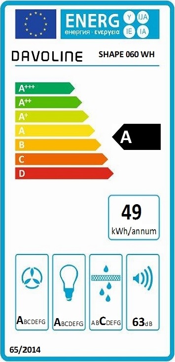 Επιτοίχιο καμίνι Davoline Shape με απορροφητικότητα 648 m3/h, ετήσια ενεργειακή κατανάλωση: 48.6 kwh και διακόπτες αφής.