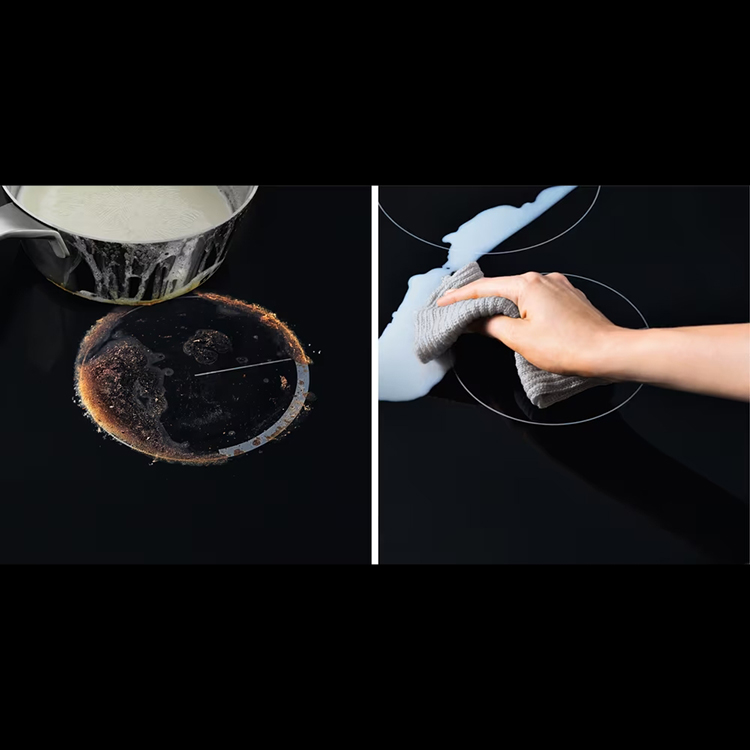Η επιφάνεια των εστιών είναι απολύτως επίπεδη και ανθεκτική στις γρατζουνιές. Και επειδή η περιοχή γύρω από το σκεύος παραμένει κρύα, οτιδήποτε χυθεί δεν θερμαίνεται και δεν κολλά στην επιφάνεια. Απλώς σκούπισέ το για να διατηρήσεις τις εστίες σου καθαρές.