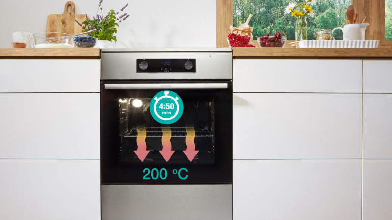 Ο φούρνος OptiBake θερμαίνεται έως και τους 200 °C σε μόλις 4,5 λεπτά, εξοικονομώντας σου 30% χρόνο σε σύγκριση με τους τυπικούς φούρνους και κάνοντάς τον έναν από τους ταχύτερους στην αγορά. Είναι ιδανικός όταν χρειάζεσαι καλά προθερμασμένο φούρνο. Μόλις φτάσει τη θερμοκρασία, σε ειδοποιεί με ηχητικό και φωτεινό σήμα.